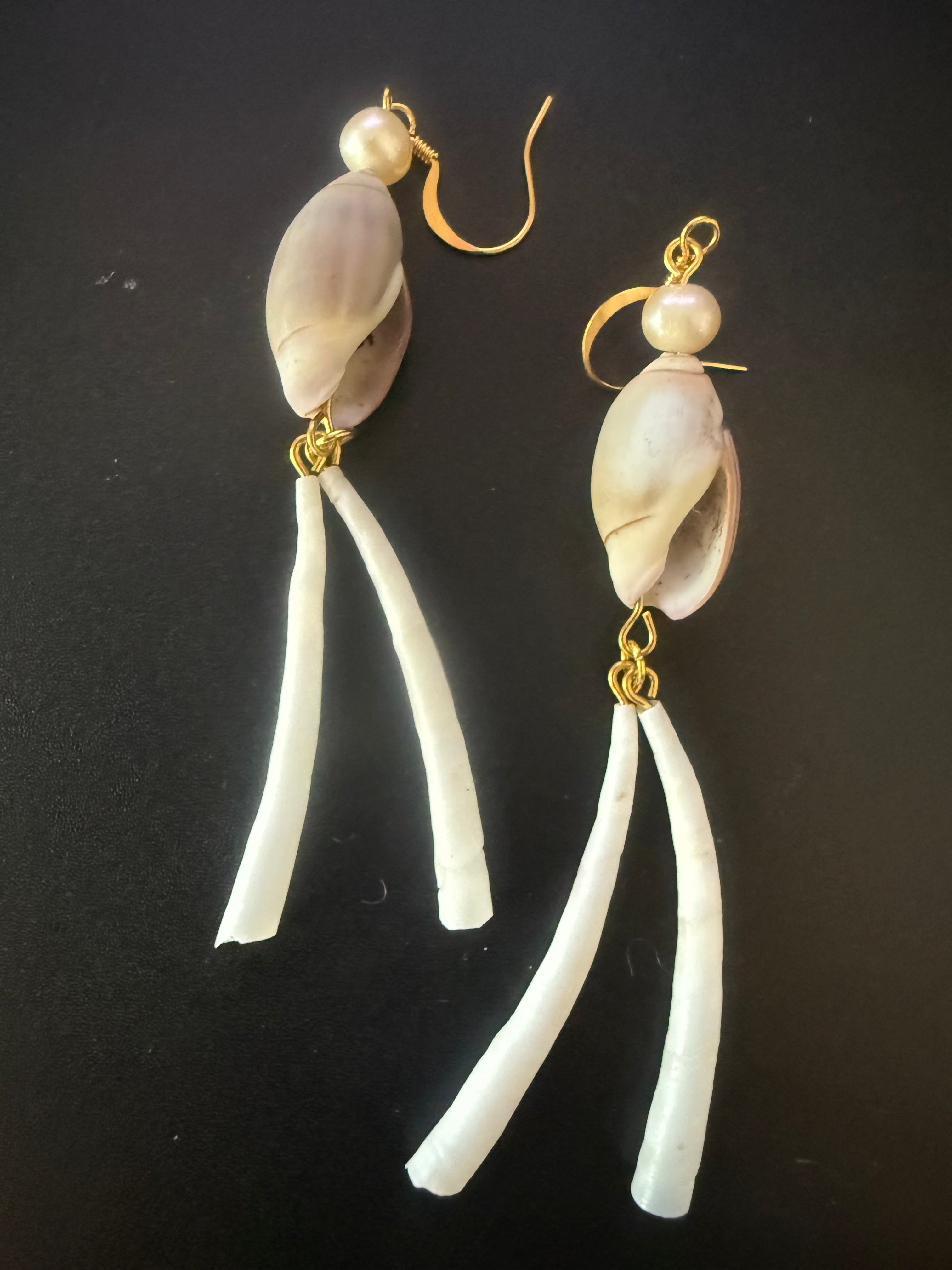 Purple Olive Shell, Pearl and Dentalium Earring By Shyla Cross