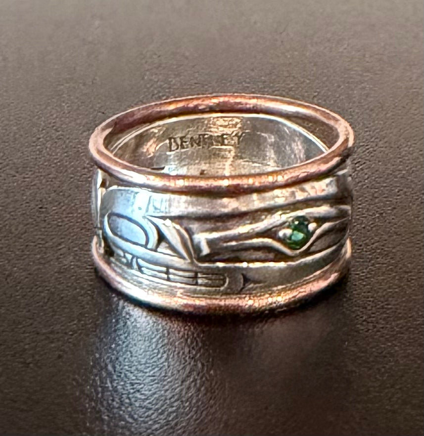 Size 10 Sterling Silver with Copper Wire Cut Out Wolf RIng With Emerald Eye By Norman Bentley