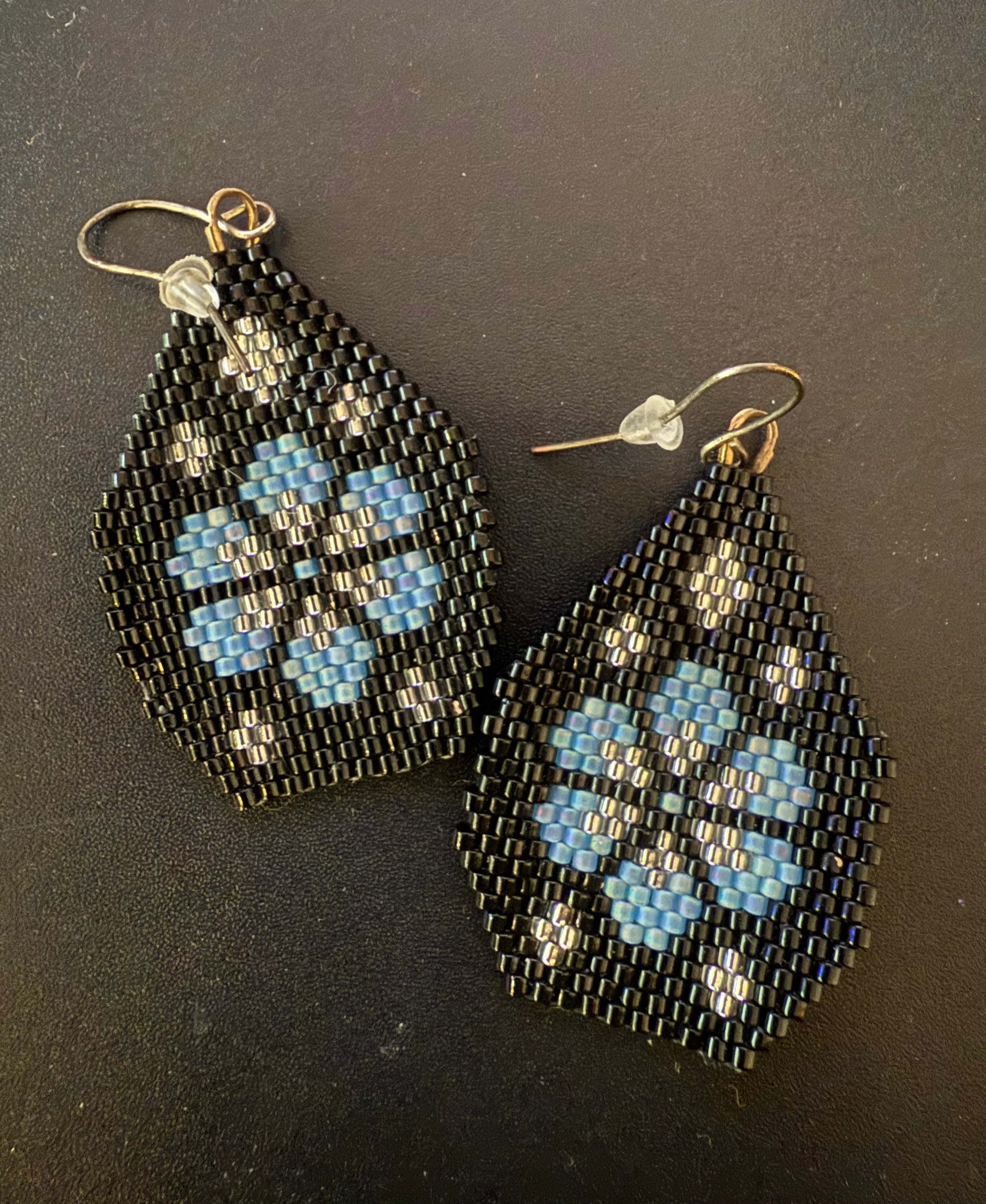 Paula Lawson Lives in Skidegate and creates beautiful beaded works including earrings, boxed bracelets and bells.