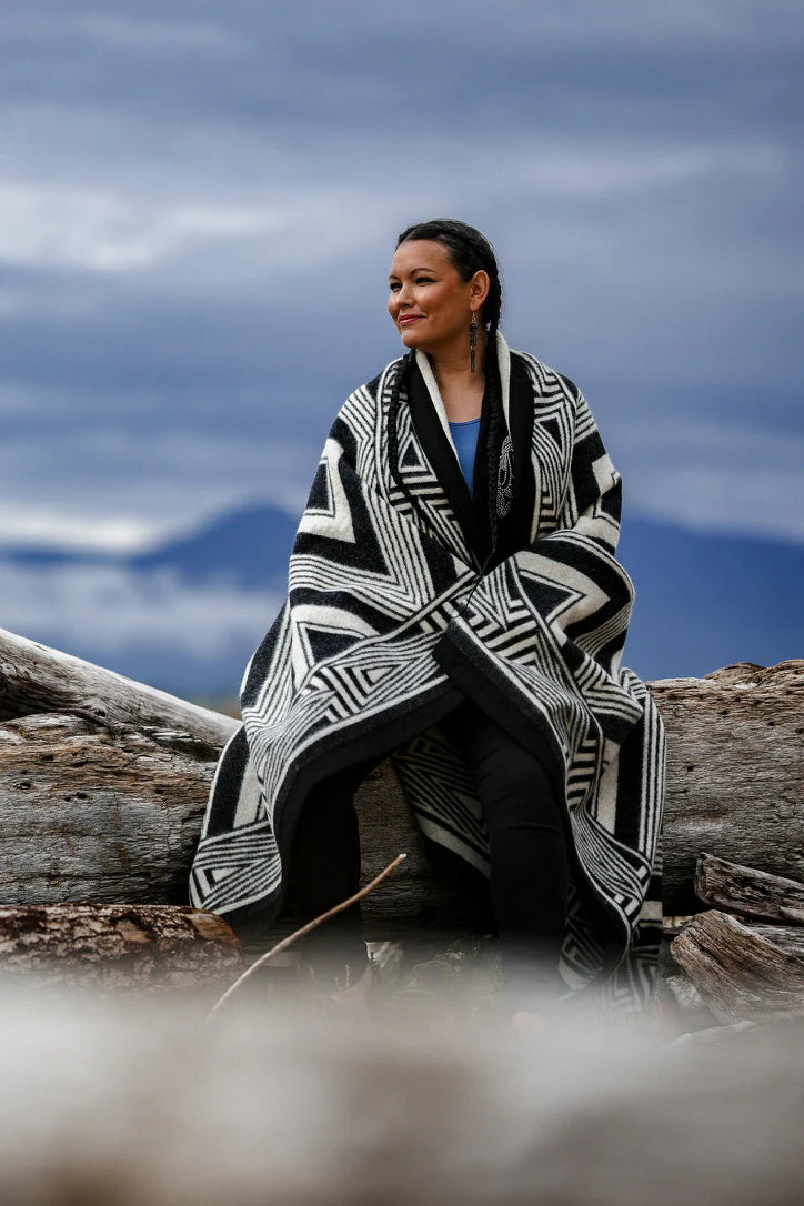 We have come to know this tradition as “Ravenstail”—from the Tlingit Yéil koowú—or “Northern Geometric” weaving. Amongst the Haida, these robes often feature prominently in myths as magical garments. There these robes carry the name Ḵwiighaalgyaat or “Cloud Blanket”.