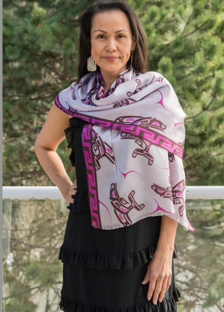 It is a bold Haida form-line art design in Silk Satin. The borders are a cresting wave design, inspired by a traditional Haida basketry design.